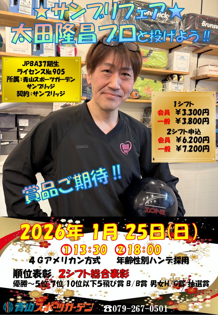 【2026年1月25日(日)】太田隆昌プロと投げよう!<サンブリッジフェア>①13:30~ ②18:00~4Gアメリカン方式 年齢性別ハンデ※2シフト総合表彰優勝~5位、7位、10位、以下5飛び賞、男女ハイゲーム賞 抽選賞奮ってご参加ください!