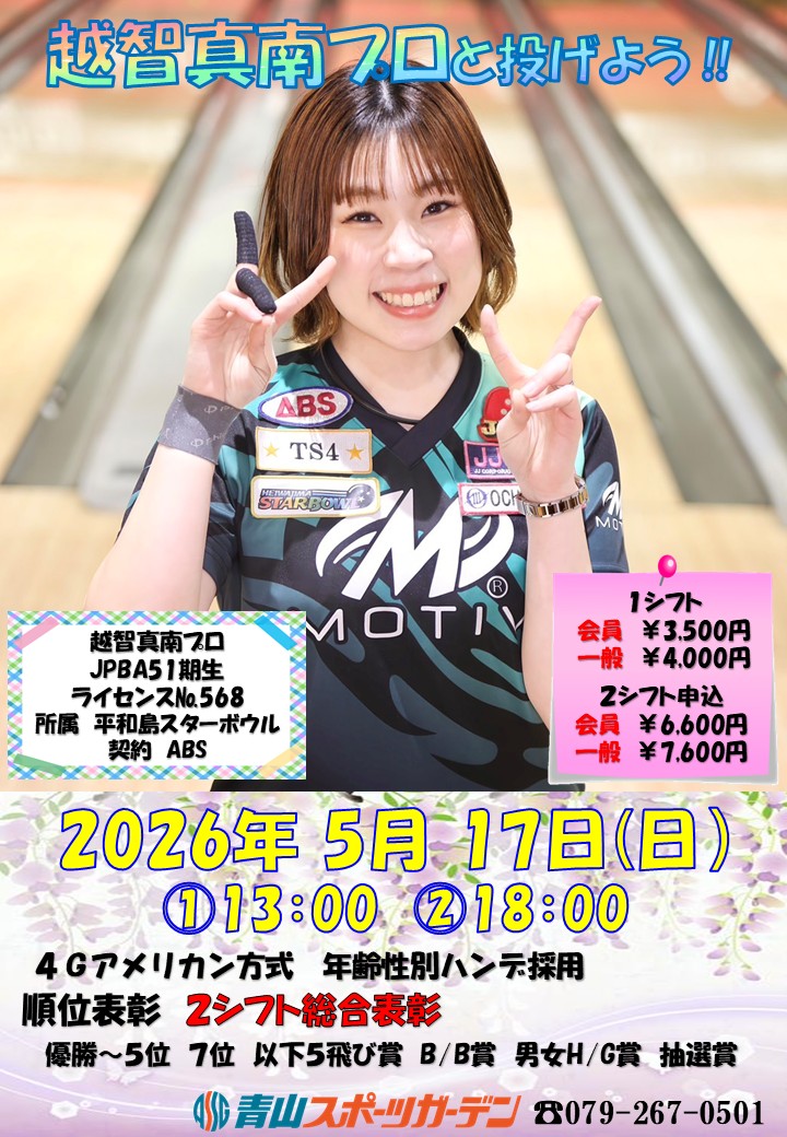 【2026年5月17日(日)】越智真南プロと投げよう!①13:00~ ②18:00~4Gアメリカン方式 年齢性別ハンデ※2シフト総合表彰優勝~5位、7位、10位、以下5飛び賞、男女ハイゲーム賞 抽選賞奮ってご参加ください!