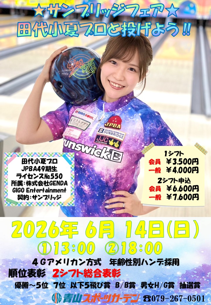 【2026年6月14日(日)】田代小夏プロと投げよう!<サンブリッジフェア>①13:00~ ②18:00~4Gアメリカン方式 年齢性別ハンデ※2シフト総合表彰優勝~5位、7位、10位、以下5飛び賞、男女ハイゲーム賞 抽選賞奮ってご参加ください!